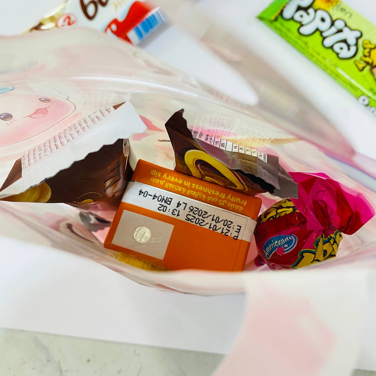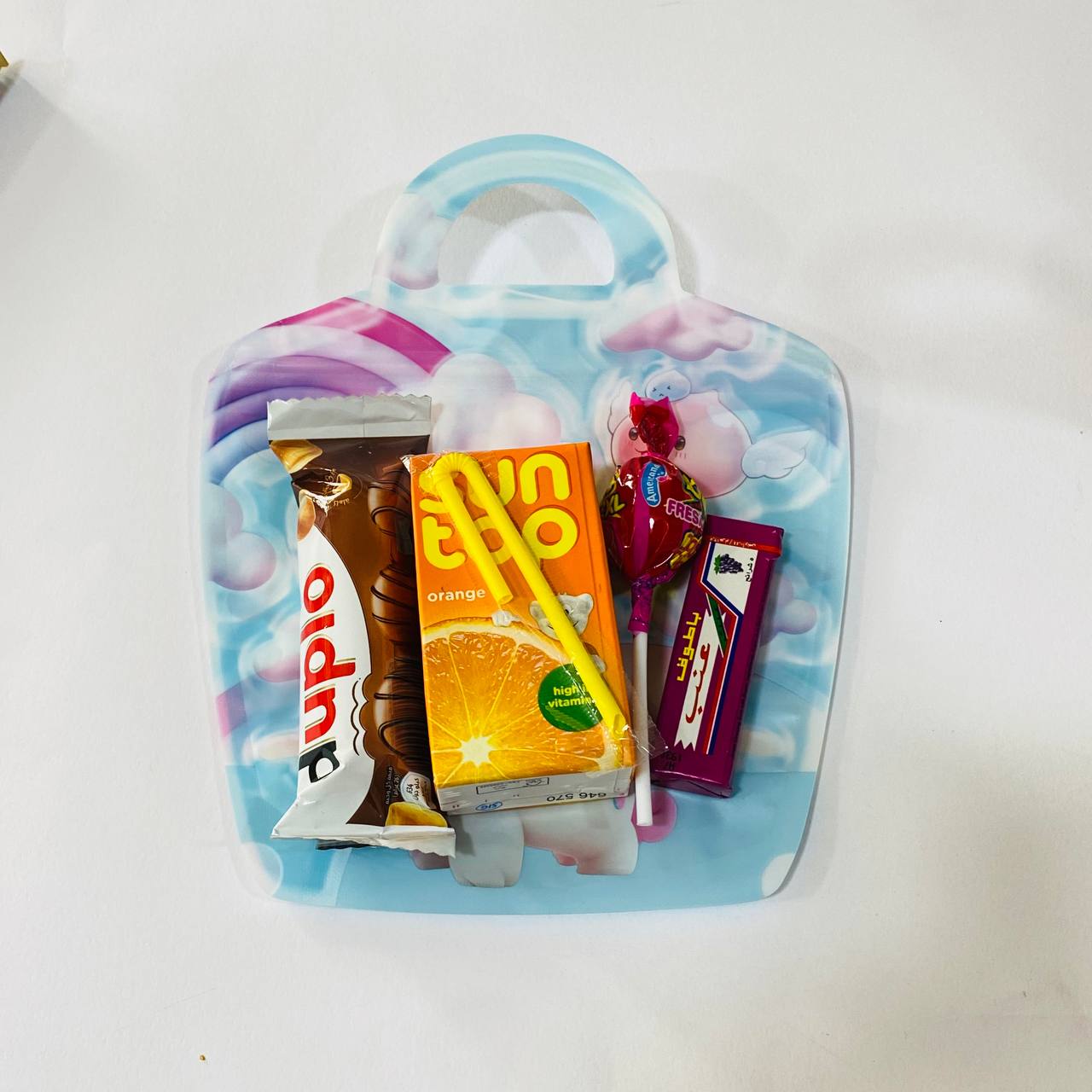 - خلوط العيد تحمل شكلاطة حجم متوسط وعصير سنتوب ومصاص ومستكة وبالون