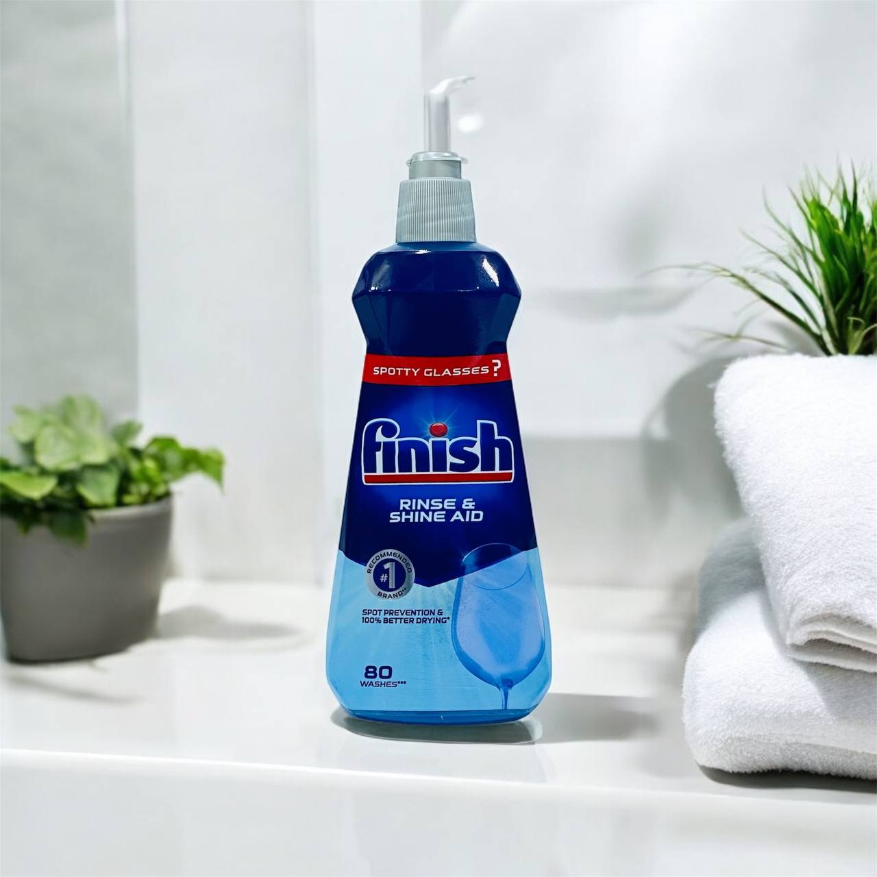 Finish Rinse & Shine Aid، وهو مساعد شطف يُستخدم في غسالات الأطباق: