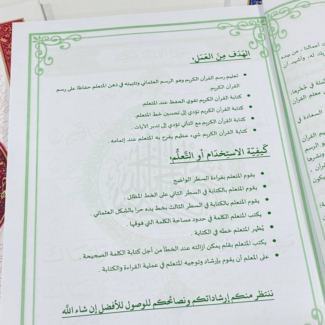 • تعليم رسم القرآن الكريم وهو الرسم العثماني وتنبيهُهُ في ذهن المتعلم حفاظاً على رسم القرآن الكريم.