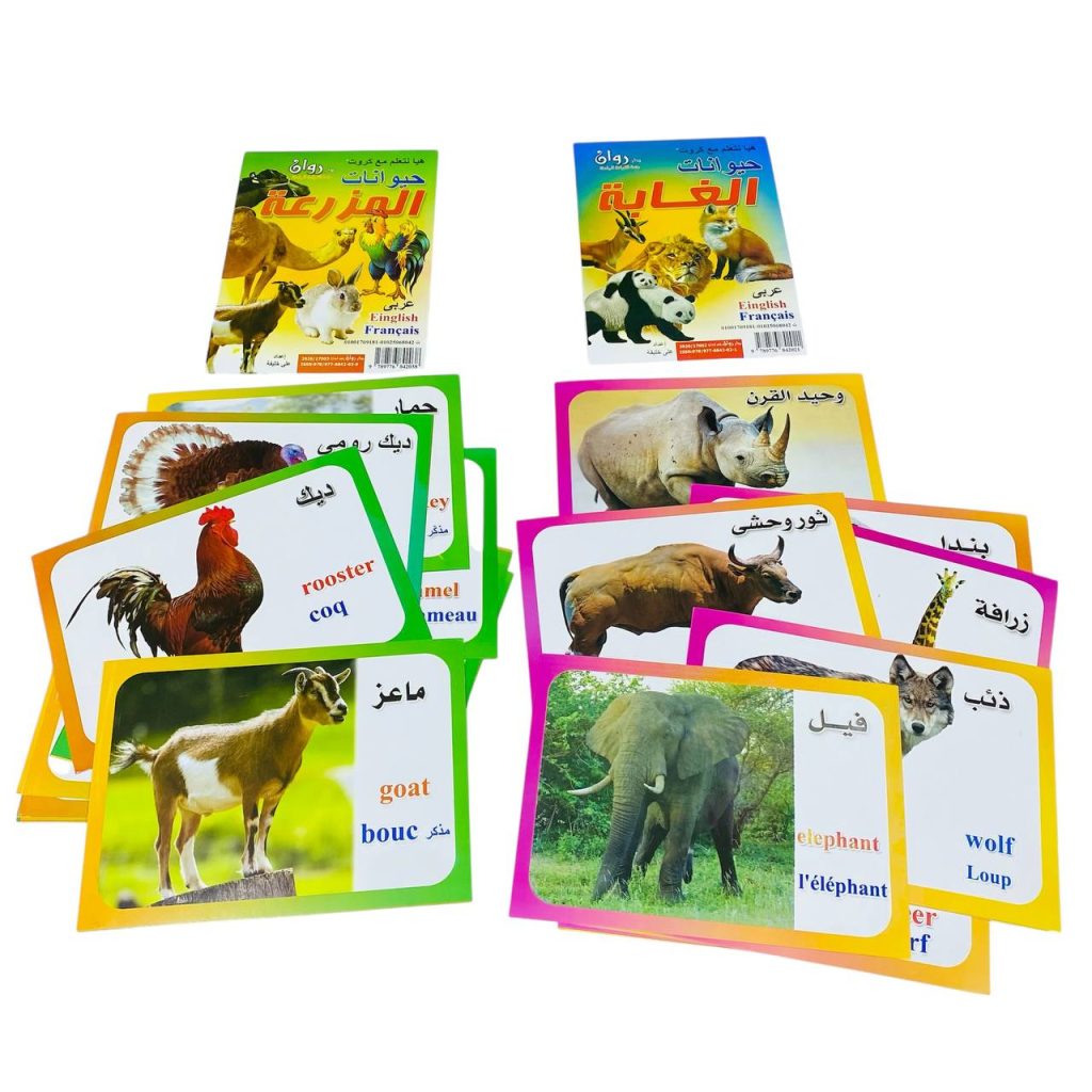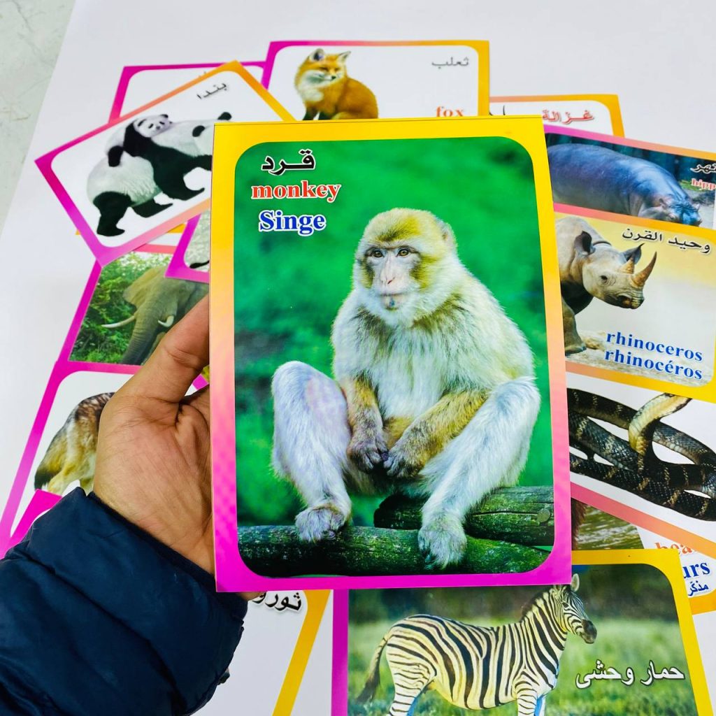 مجموعة بطاقات الحيوانات التعليمية للاطفال 17 كرت مقوى عربي انجليزي فرنسي